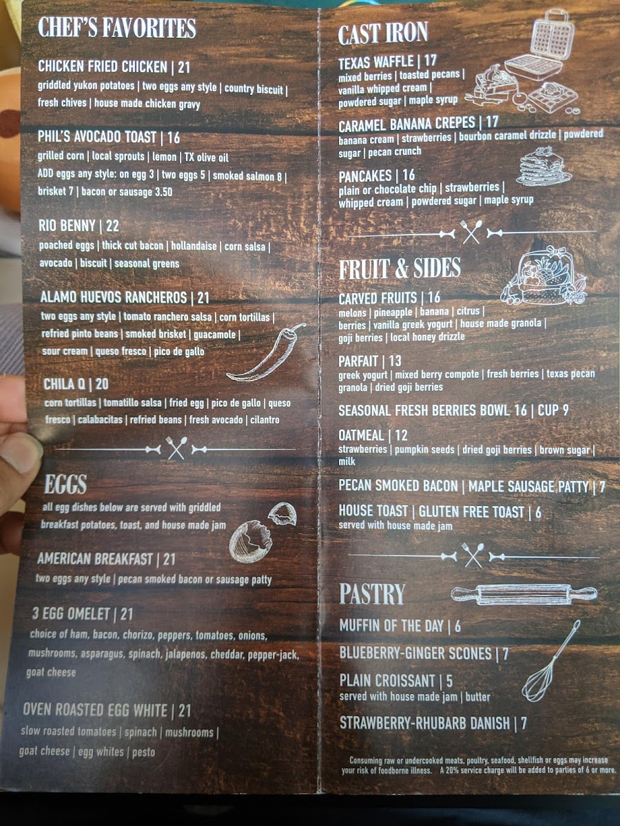 two eggs any style | salsa ranchera | corn tortillas | refried pinto beans | smoked brisket guacamole | sour cream | queso fresco | pico de gallo